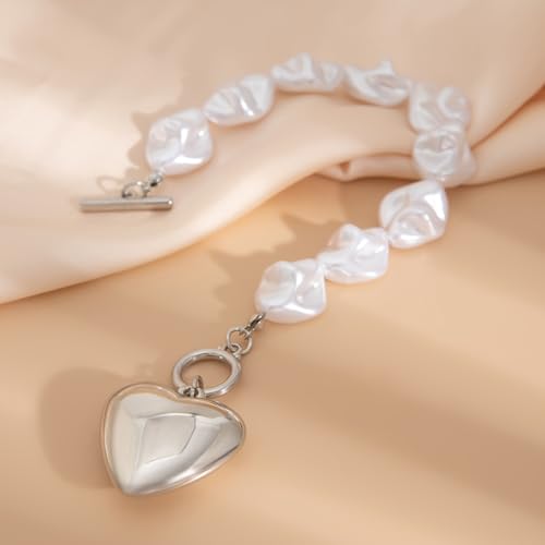 Chunky Gold Heart Bracelets for Women Large Pearl Heart Chain Bracelet Geometric Baroque Pearl cherish Toggle Clasp Bracelet Trendy Birthday Jewelry Gift