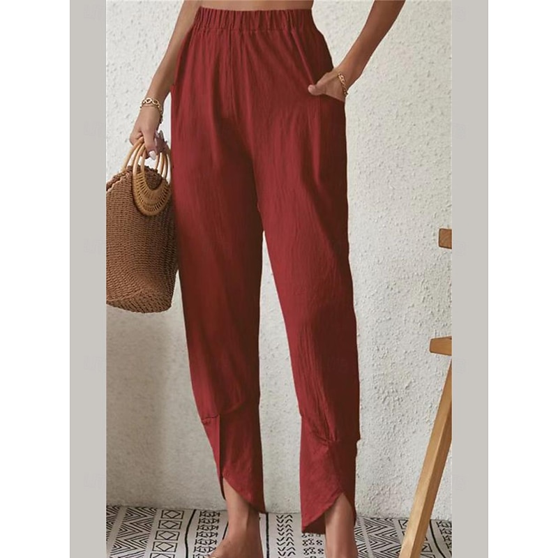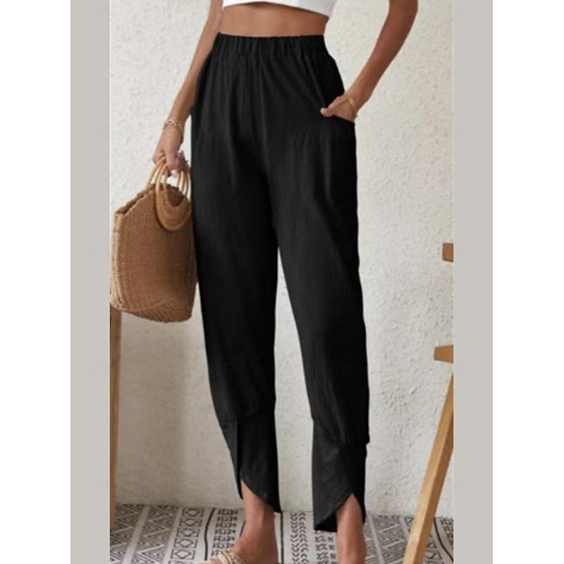 Highlights [Fabric and Fit] : Crafted from a lightweight and breathable linen cotton blend, these women's ankle-length pants are designed for ultimate comfort during the spring and summer seasons. The casual, loose-fitting style offers a regular fit that pairs effortlessly with any wardrobe selection, making them a versatile choice for daily wear. [Design Highlights] : Featuring a modern and chic design, these pants come with a comfortable elastic waistband that ensures easy wearability throughout the day. The side pockets add practicality and convenience, while a unique hemline design contributes a touch of contemporary style. [Occasions] : Perfect for weekend outings and casual daily activities, these pants provide a relaxed yet chic look. Ideal for pairing with a simple top and sandals, they offer a laid-back, effortless outfit that suits a variety of laid-back occasions. [Size Range] : Available in sizes S, M, L, XL, and 2XL, these pants cater to a wide size range to accommodate different body types. The variety of color options, including Black, White, Dark Gray, Wine, Khaki, and Dark Navy, ensures a suitable match for personal style preferences. Perfect for everyday use. finest materials and excellent craftsmanship ensure long-lasting durability.